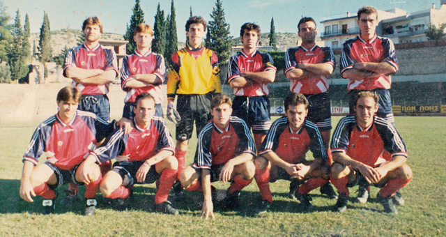 Στη φωτό κάτω, ο Μπόλμπασης με τη φανέλα του τερματοφύλακα, ο Μαντουδιανός Τσιμιλιώτης όρθιος, δεύτερος από δεξιά και ο Μπάμπης Σαχίνης κάτω, δεύτερος από δεξιά.