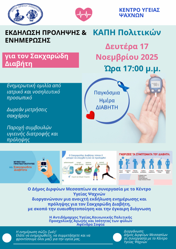 Ο Δήμος Διρφύων - Μεσσαπίων, σε συνεργασία με το Κέντρο Υγείας Ψαχνών, διοργανώνουν μια ανοιχτή εκδήλωση ενημέρωσης και πρόληψης για τον σακχαρώδη διαβήτη.